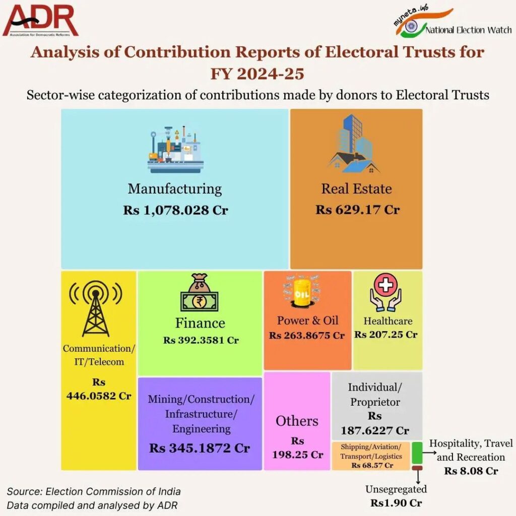 - 2024-25 मध्ये ट्रस्टना 3826 कोटी रुपये देणग्या मिळाल्या आणि जवळपास तितकेच 3826 कोटी रुपये राजकीय पक्षांना वाटले गेले.